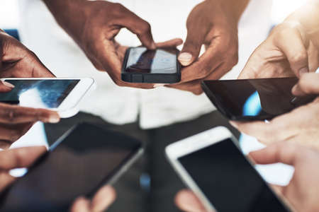 Get connected and stay in the know. Closeup shot of a group of unrecognizable businesspeople using their cellphones in synchronicity.