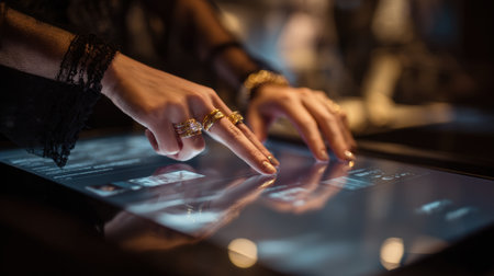 Close-up of a woman's hands interacting with a modern touchscreen checkout in a boutique. The scene is set with elegant lighting, showcasing a minimalist and realistic style.