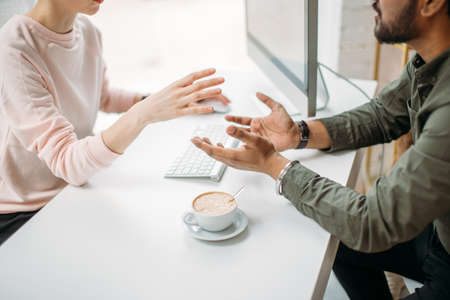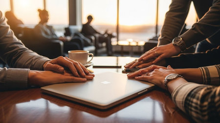 Collaborative team meeting showcasing hands reaching out in agreement during a work discussion at a modern office setting in the afternoon