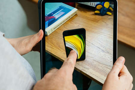 Paris, France - April 16, 2020: Curious Woman looking on Apple Computers internet website on iPad Pro tablet new iPhone SE inspection on Augmented Reality display