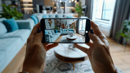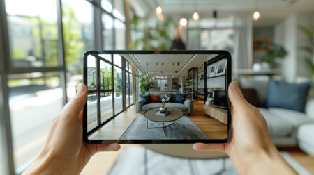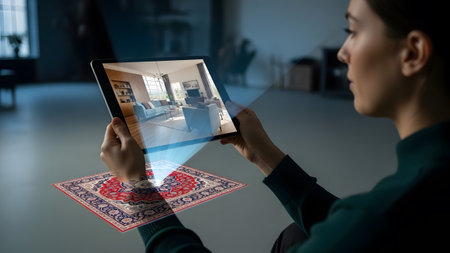 Woman uses tablet to preview rug placement in a modern living room setting. Clear details and vib...