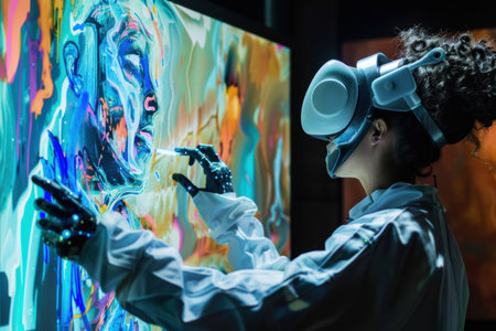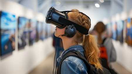 Art enthusiast exploring a virtual museum with VR headset, admiring digital reproductions of famous artworks
