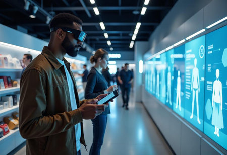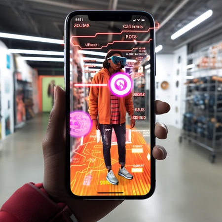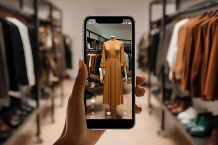 Person uses a smartphone to preview fashion styles with augmented reality in a store environment.