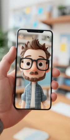 Hand holding a modern smartphone in vertical orientation, displaying a 3d animated avatar with glasses and a beard through an augmented reality application with digital icons for interaction