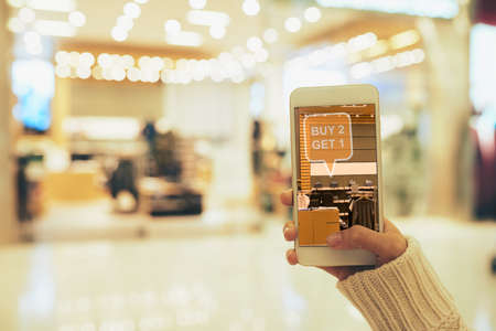 Close-up shot of young woman using smartphone with augmented reality app while doing shopping at clothing shop, blurred background