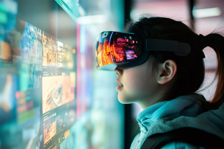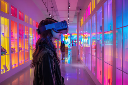 A young woman explores a vibrant, neon-lit virtual world, wearing a VR headset in a futuristic environment.