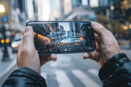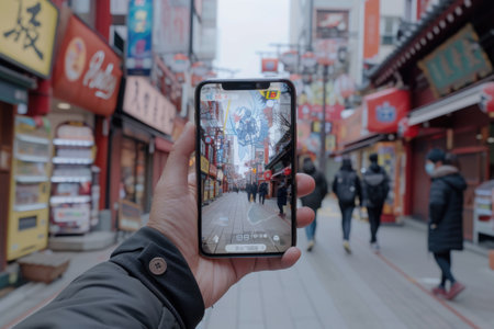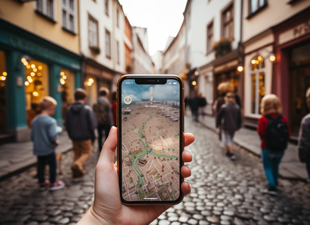 Virtual assistant on display, guiding urban exploration via smartphone. AI travel technology.