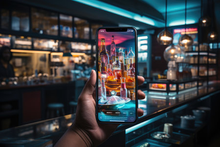Augmented reality marketing . Hand holding smart phone use AR application to check information