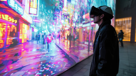 person explores a vibrant city street at dusk while wearing augmented reality glasses engaging with digital information overlaying their surroundings.