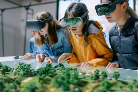 Happy children wearing visual reality goggle while connecting metaverse for experience and learning about simulated program. Smart adult or teenager playing reality game by using VR headset. AIG42.