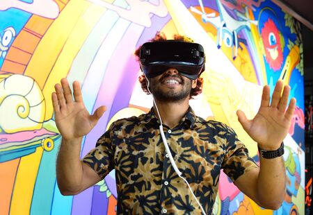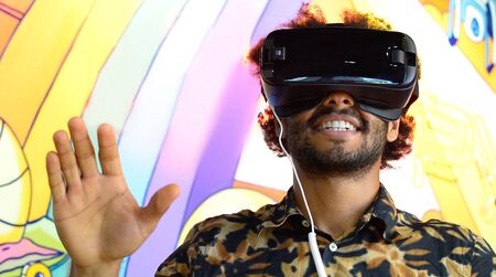 The dark-skinned cheerful guy plunged into the virtual world, wearing virtual reality glasses. Portrait of a positive african american with afro hairstyle on bright color background.