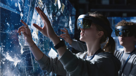 A young woman wearing virtual reality glasses interacts with an immersive data visualization.