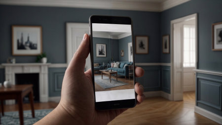 A person is holding a smartphone with an augmented reality app open, showing a blue room with gray walls and a wooden floor