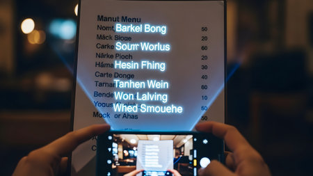 AR overlay on a restaurant menu showing translated text and prices, viewed through a smartphone.