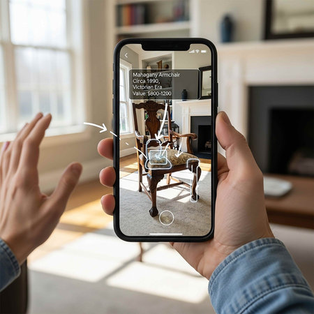 Hand holding smartphone displaying AR measurement overlay on a grey sectional sofa. Clear details...