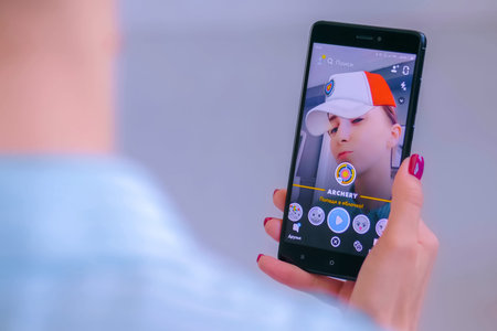MOSCOW, RUSSIA - MAY 24, 2019: Woman using Snapchat multimedia messaging app with 3d face mask filter on smartphone at home. Face detection technology, AR, social media, selfie, entertainment concept