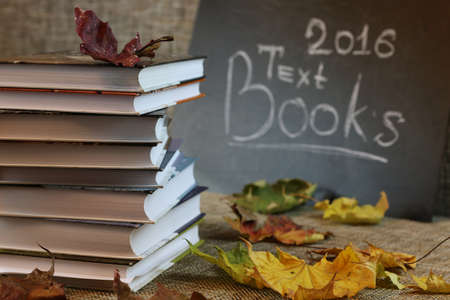 Lots of blue books on a wooden table. On a wooden background are books with a blue cover. Blue book cover.