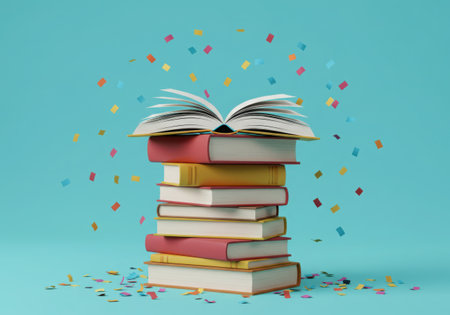 A vibrant stack of hardcover books, topped with an open volume, is showered with colorful confetti against a bright turquoise background, symbolizing celebration and learning.