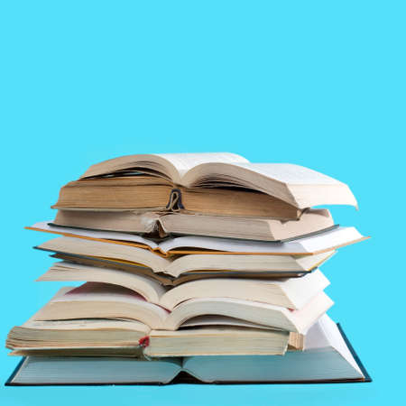 many stacks of educational open books for learning preparation for college exams on a blue paper craft background. Self-education. On-line education in time of isolation
