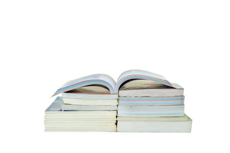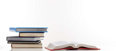 Open hardback book, diary, fanned pages on stack of books on white table in library. Books stacking. Back to school concept. Copy Space. Education learning background