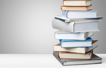 A stack of five colorful books rests on a tablet, with one book opened to display its pages. The setup is in a minimalist workspace, emphasizing simplicity and modern design.