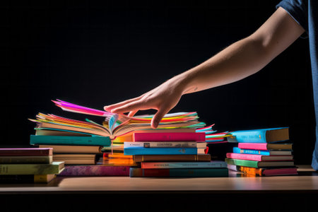 A person's hand browsing through a colorful stack of books with pages glowing against a dark background, depicting the concept of knowledge, learning, and education.
