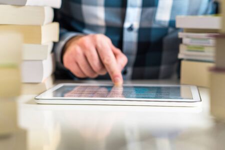 Man reading electronic book with reader. Touching screen with finger. Book on tablet or smart mobile device surrounded by stacks of books.