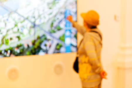 MOSCOW, RUSSIA - August 29, 2018: Modern Museum of Russia History. Woman using interactive display with no touch control technology. Education and modern concept