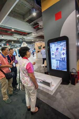 SHANGHAI, CHINA - SEPTEMBER 2, 2016: Attendees of Huawei Connect 2016 information technology conference test virtual fitting room simulator at exhibition hall in Shanghai, China on September 2, 2016.