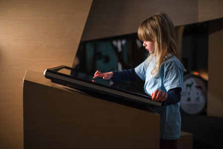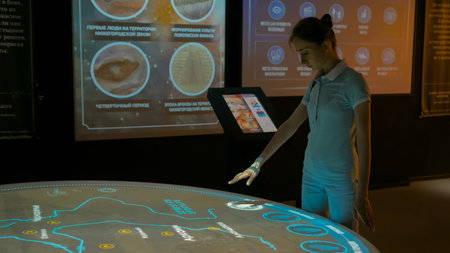 Woman using interactive touchscreen display in modern historical museum. Evening time, lowlight. Education and entertainment concept. Close up shot