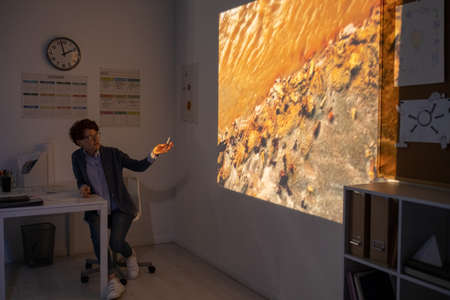 Young teacher pointing at polluted water during video presentation about environmental protection