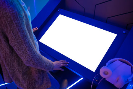Woman looking at white blank interactive touchscreen display of electronic multimedia kiosk in dark room of technology exhibition - close up view. Mock up, copyspace, template and futuristic concept