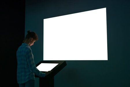 Woman looking at white blank interactive touchscreen display of electronic multimedia kiosk in dark room of technology exhibition. Large white display on wall. Mock up, copyspace and template concept