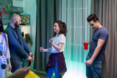 Friends dance together full of happiness at a party. Man with cool dancing moves.