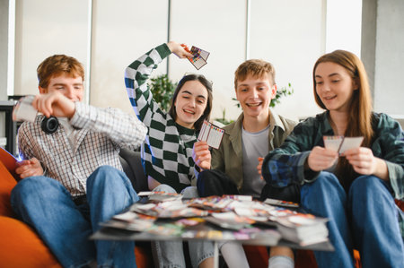 Four cheerful teenagers are sitting on a comfortable sofa, playing a board game and having fun together
