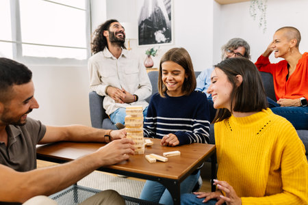 Four young adults engaging in a playful challenge, carefully removing blocks from a wooden tower while enjoying their leisure time together
