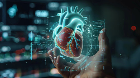 An interactive augmented reality visualization of human heart anatomy with holographic overlays and data points.