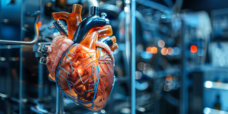 Human heart model in a science laboratory, close-up view.