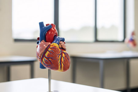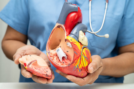 This image captures a close-up of an anatomically correct model of a human heart in a medical setting.
