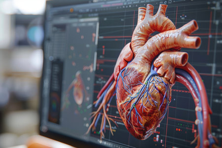 High-tech medical workstation displays a vivid 3D model of a human heart reconstructed from CT scans. The workstation is equipped with advanced imaging technology and analysis tools.