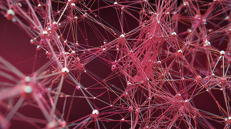 Stylized digital illustration of a complex neural network with glowing spheres and connecting lines on a dark background. Represents artificial intelligence, data science, and digital communication systems. Ideal for tech, innovation, and machine learning themes.