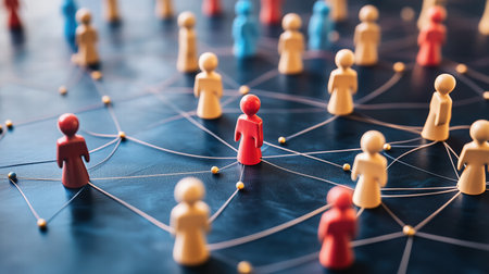 A network of tiny human figures is linked by red lines, illustrating interconnectedness. The composition showcases a macro perspective with shallow depth of field, emphasizing the web-like structure. The lighting appears diffused and soft, creating shadows. This visual is potentially useful in discussions of networking, community, and digital systems.