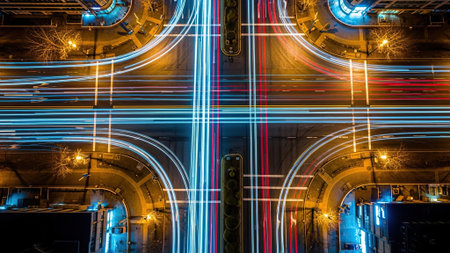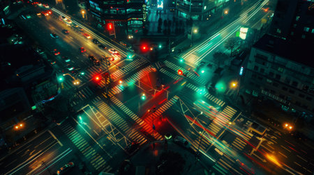 Aerial view of a busy urban intersection at night, showcasing car lights creating dynamic patterns. This vibrant scene captures city life and movement.