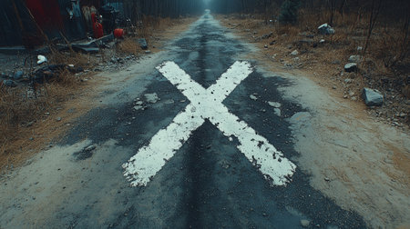 A solitary road stretches forward with a bold white X marking on the pavement, surrounded by a barren, rugged landscape, evoking mystery and isolation.
