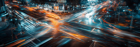 City lights creating dynamic light trails at a busy intersection depicting speed and modern life. Urban intersection showcasing rapid light trails and motion blur