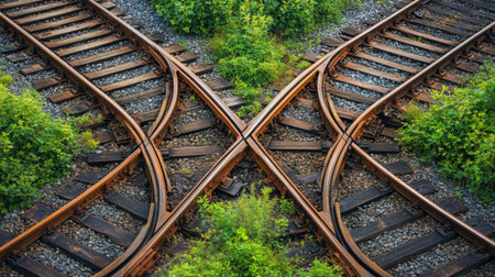 A captivating view of intersecting railroad tracks surrounded by vibrant greenery, showcasing a peaceful blend of nature and transportation.