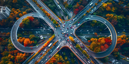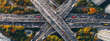 Aerial view of a busy highway intersection showcasing urban transportation infrastructure. Concept Cityscape, Traffic Flow, Urban Mobility, Transportation Network, Highway Intersection