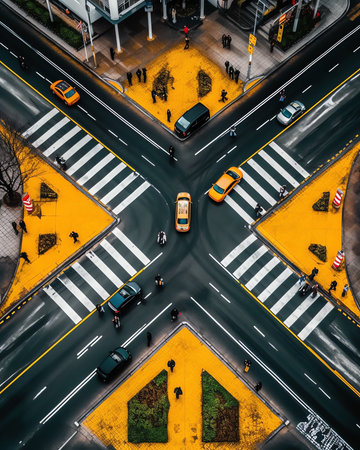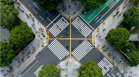 Capturing an aerial perspective of an urban intersection, this image showcases pedestrian movement and unique shadows cast by crosswalks.