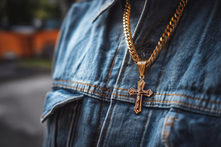 Stylish close up of a golden cross necklace on denim jacket with urban street style vibe