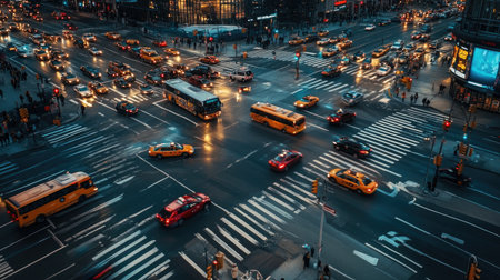 An intersection with cars moving in different directions, traffic lights, and pedestrian crossings, showing the organized chaos of city traffic.